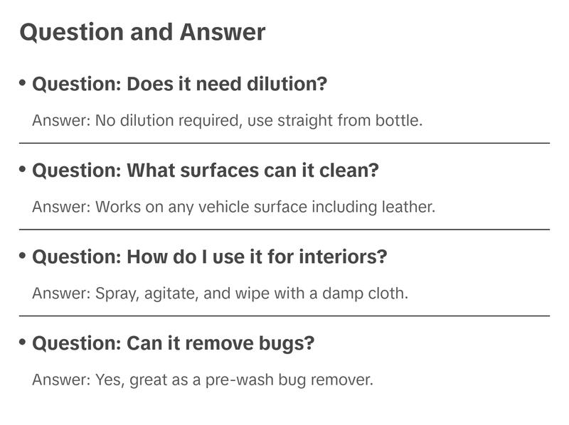 Exterior: Spray and agitate with a detailing brush or microfiber applicator pad. Rinse thoroughly.